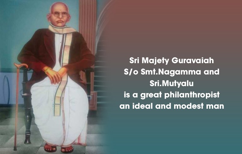 Sri Majety Guravaiah is a great philanthropist an ideal and modest man. His parents are Smt.Nagamma and Sri.Mutyalu. His native place is Kantamrajukonduru,Duggirala Mandal,Guntur district. When he was young, he did tobacco business in Guntur. He was a pious man who followed " Sanathana dharma". He was a philosophical,thinker,great donor. Sri Veera Pratapa Anjaneya Swamy Temple and Kasi Visveswara Temples in Guntur were constructed by Sri Guravaiah garu. Apart from the construction, he donated his own lands for the maintenance of temples .He also constructed " Sri Rama Arya Vysya Satramu" near the railway station in Guntur.